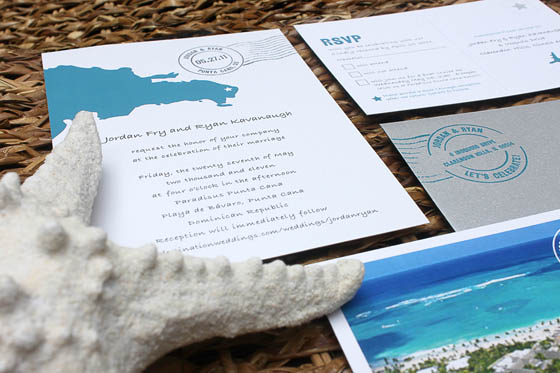 I absolutely love how Jordan and Ryan's destination wedding invitations turned out! The full suite embodied the couple's vision of a sophisticated beach celebration. For the design, I started with the postage stamp element I created for Jordan's bridal shower invitations. This design element created a sense of consistency across communications and was the perfect vehicle to house their names, wedding date and location on all wedding pieces. The 5x7 invitation card featured an illustration of the Dominican Republic island. A star marked their wedding location in Punta Cana. The 2-sided RSVP postcard was probably my favorite piece. The front showcased an overhead photograph of their resort - Paradisus Punta Cana - which I treated with a painterly effect for a more graphic look. The back of the postcard housed the couple's return address as well as a reply section for guests. The shimmery silver envelopes tied all of the components together and featured the postage stamp design too.